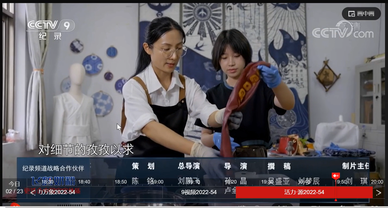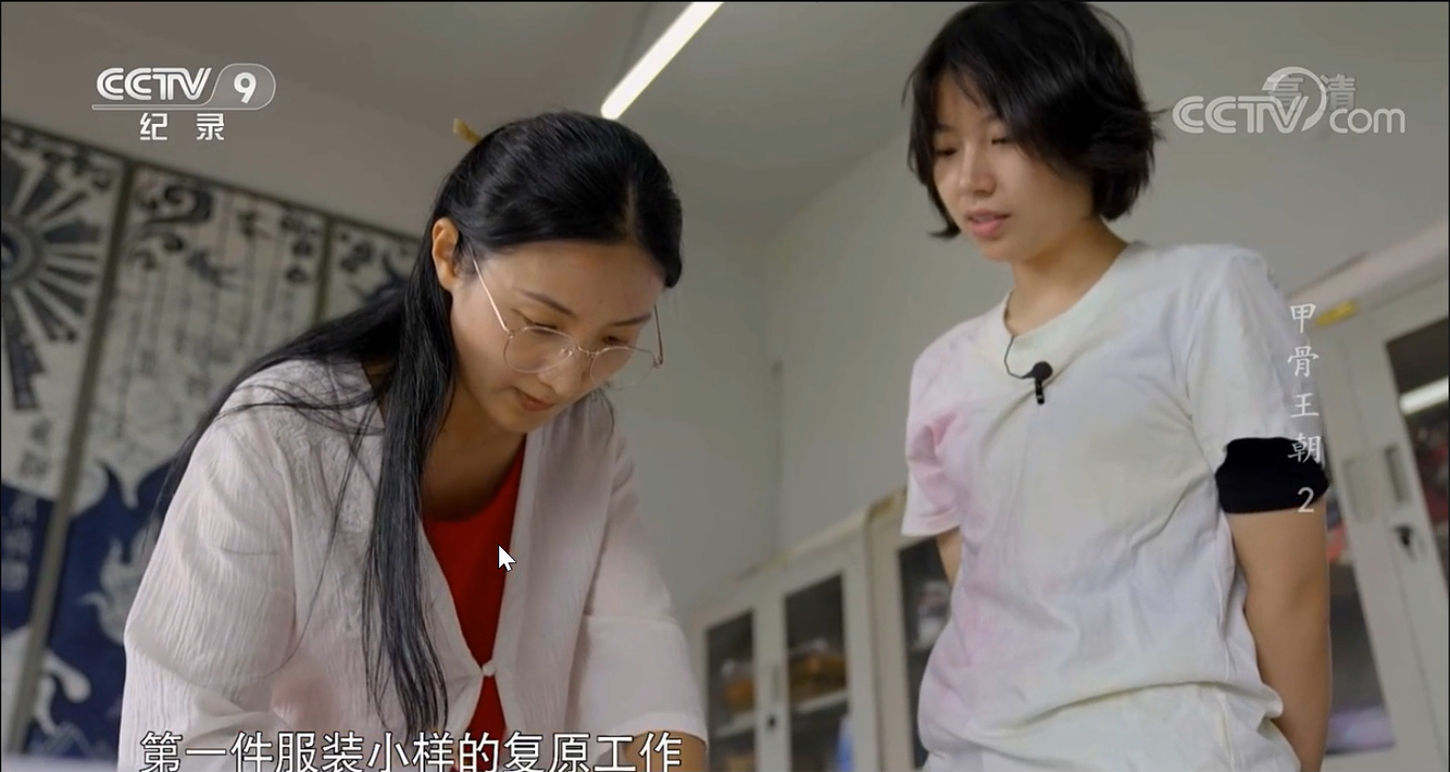 2022年2月23日19:24分,中央电视台CCTV-9纪录频道播出《甲骨王朝》第二集,我校美术学院陈娟老师出镜演示商代服饰染色制作工艺。