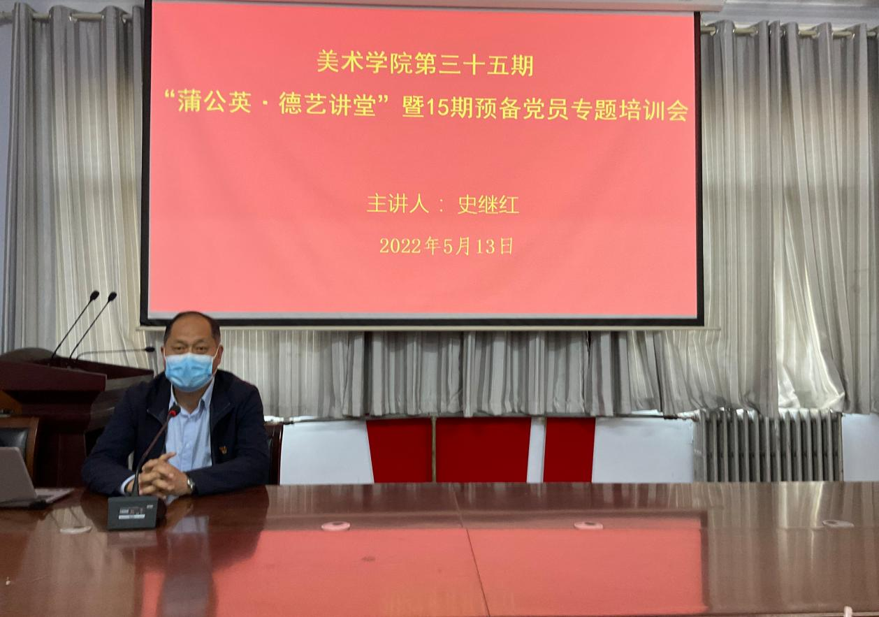 为坚定广大青年学生的入党初心,筑牢政治理论根基,5月13日下午,美术学院在七号楼三楼会议室召开第三十五期“蒲公英·德艺讲堂”暨15期预备党员专题培训会。会议由院党委书记史继红主持,第15期全体预备党员参加培训。