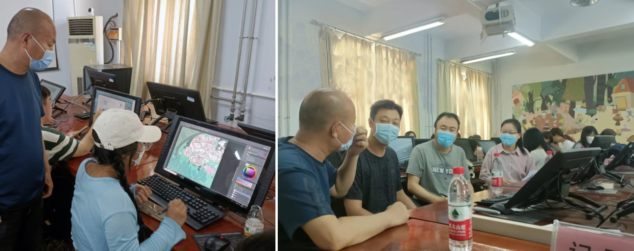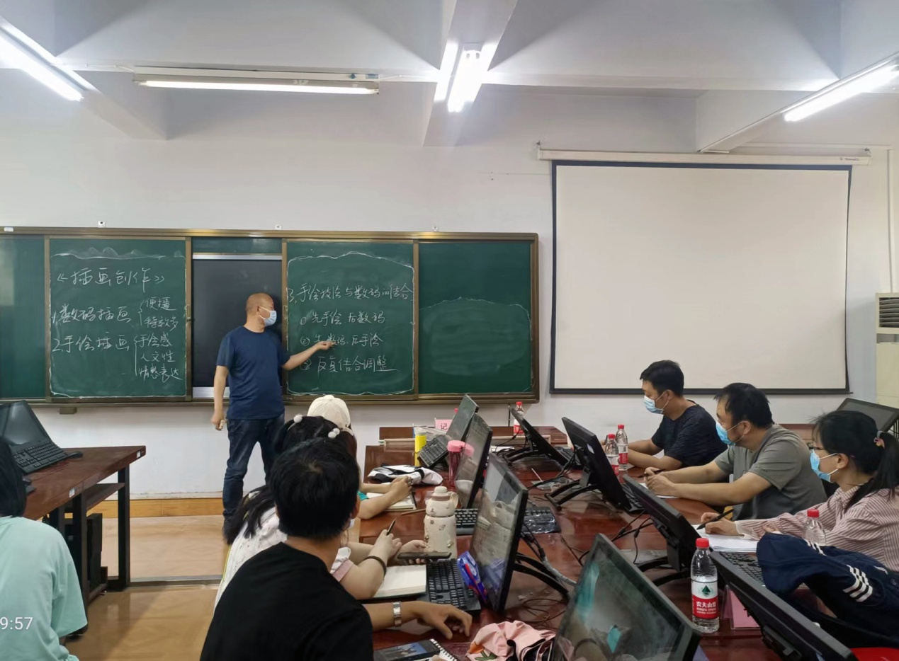 2022年5月24日下午第5节,美术学院刘军辉老师的《插画创作》公开课在美术学院10号教学楼108室的插画实验室进行。卜速、程坤和刘爽等老师观看了公开课的现场教学。