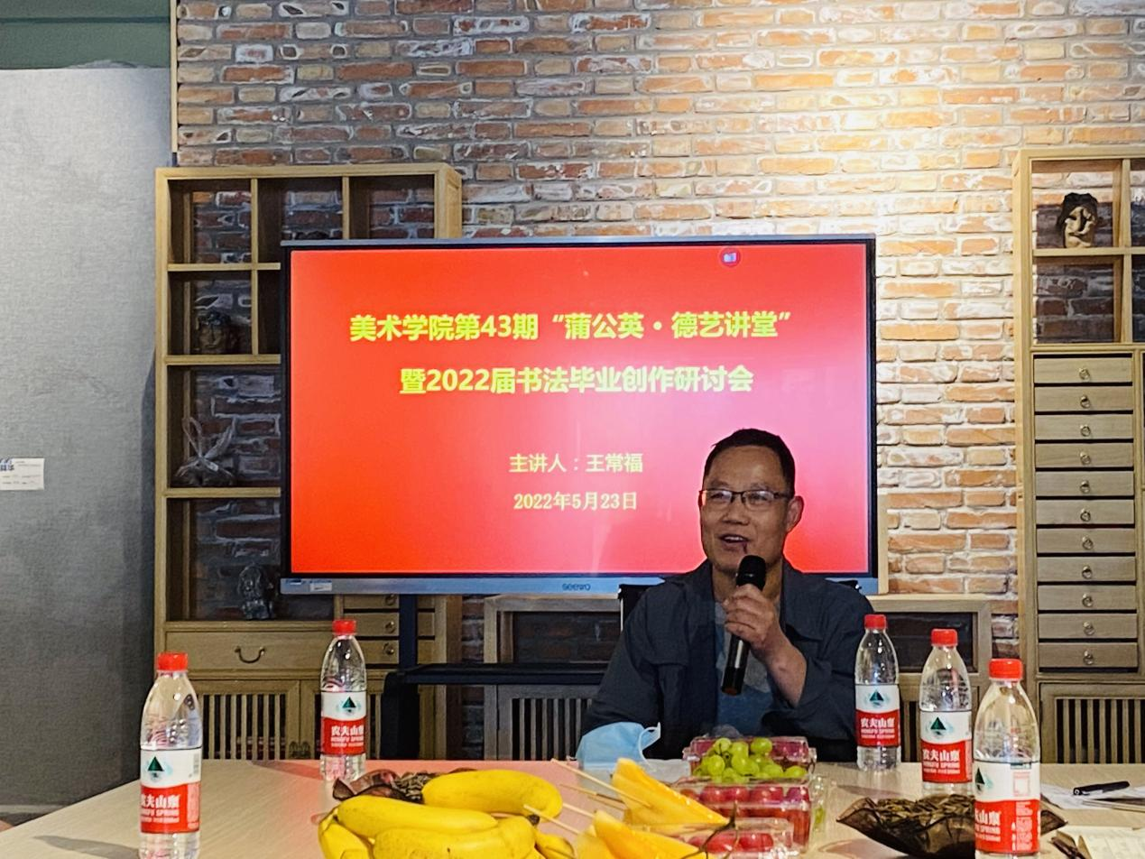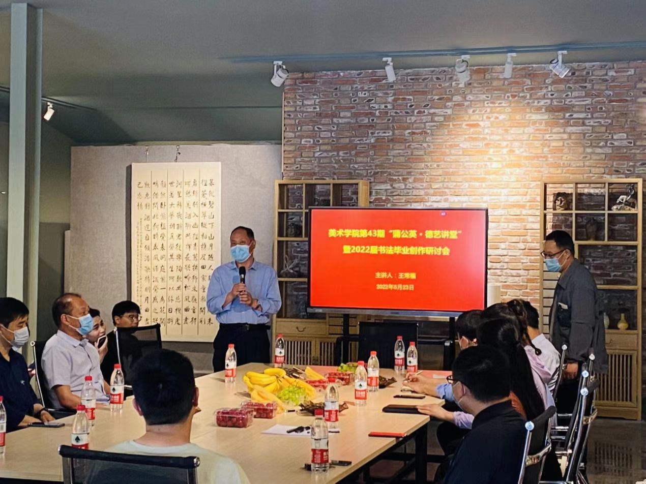5月23日,美术学院在文创展厅举办第43期“蒲公英.德艺讲堂”暨2022届书法毕业创作研讨会。院党委书记史继红、副书记付松山、副院长曹天成、张亮及书法专业全体教师与毕业生参加研讨会。会议由书法教研室主任王常福主持。