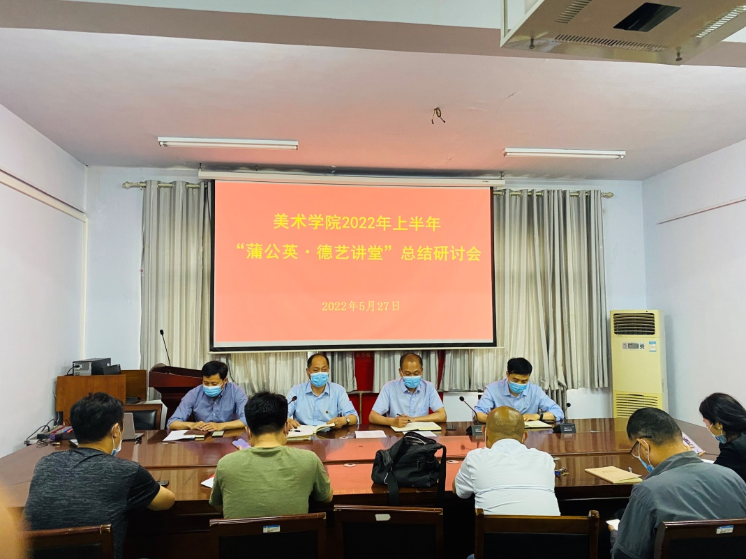 5月27日,美术学院在七号楼三楼会议室召开2022年上半年“蒲公英·德艺讲堂”总结研讨会。院党委书记史继红、副书记付松山、副院长曹天成、张亮及“蒲公英·德艺讲堂”主讲教师参加会议。会议由史继红主持。