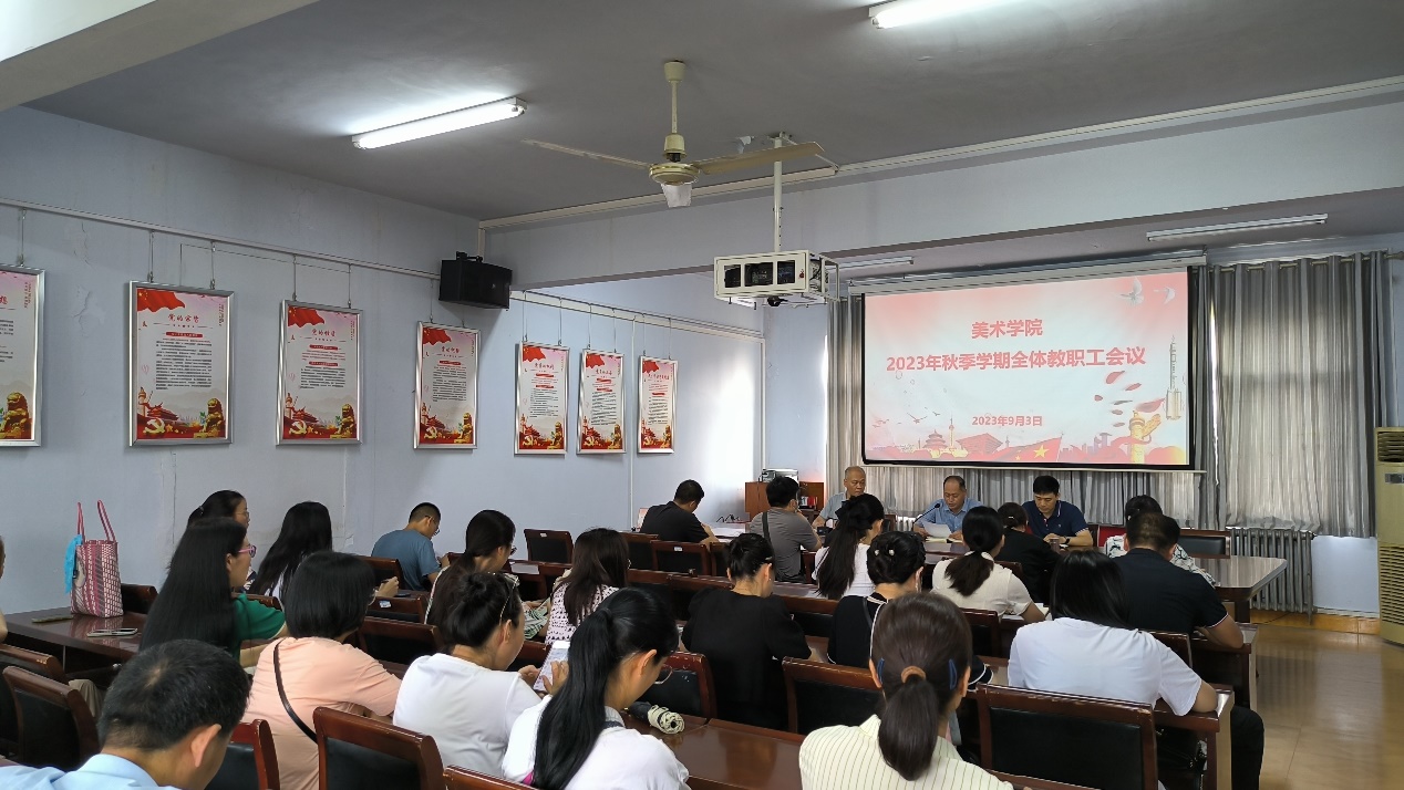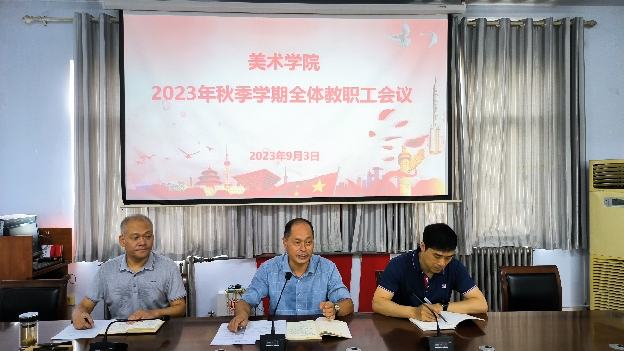 9月3日下午,美术学院在七号楼三楼会议室召开2023年秋季学期全体教职工会议,对新学期工作进行安排部署。院党委书记史继红、副书记付松山、副院长张亮及全体教职工参加会议。会议由史继红主持。