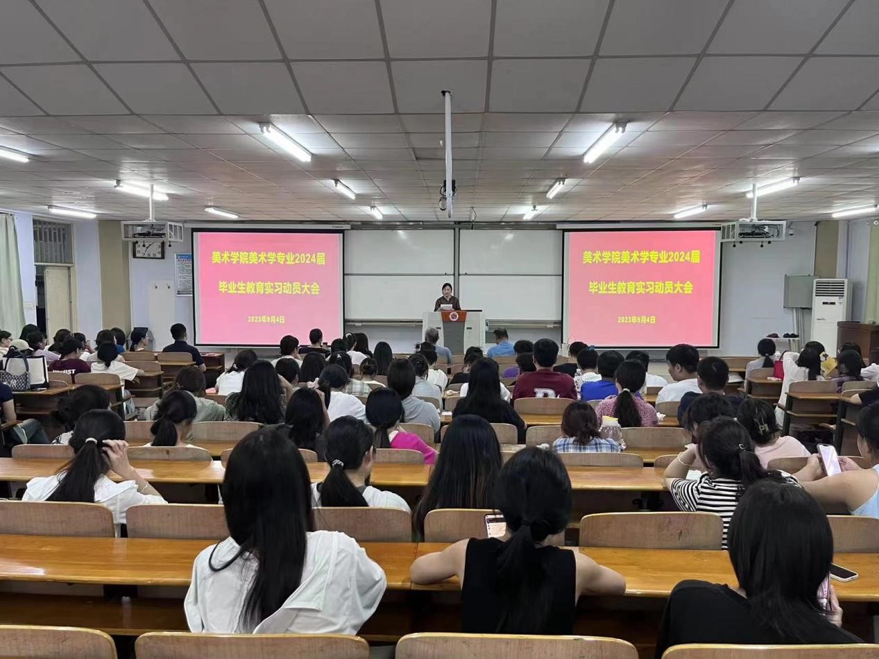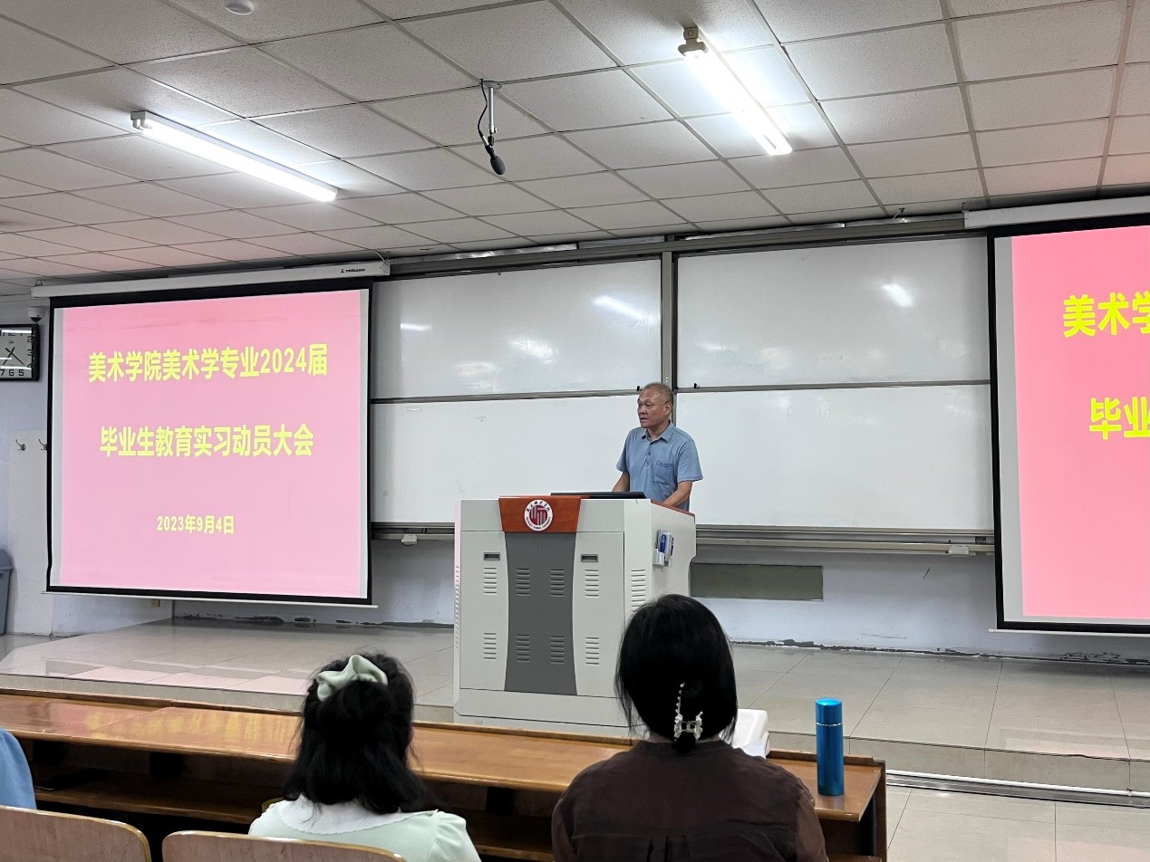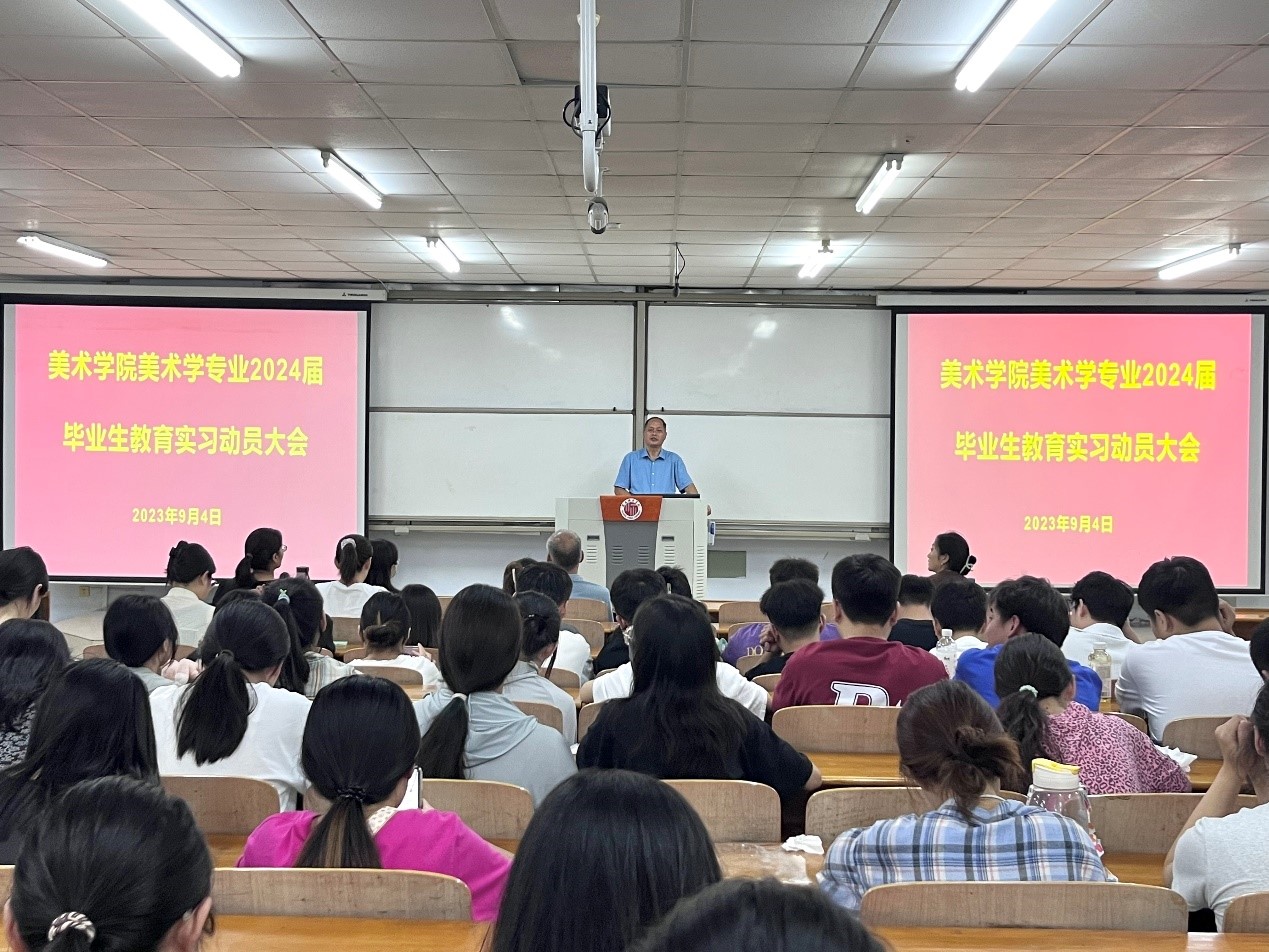 教育实习是理论与实践相结合的重要教学环节之一,为扎实做好教育实习工作,提高学生实践教学能力,进一步加强专业人才培养,9月4日,我院在智圆楼208教室举办2024届毕业生教育实习动员大会暨微型课专题讲座。商丘市基础教育教学研究室美术教研员潘琦,我院党委书记史继红、党委副书记付松山、美术学系全体教师及2024届师范类毕业生参加活动。活动由美术学系主任杨烨主持。