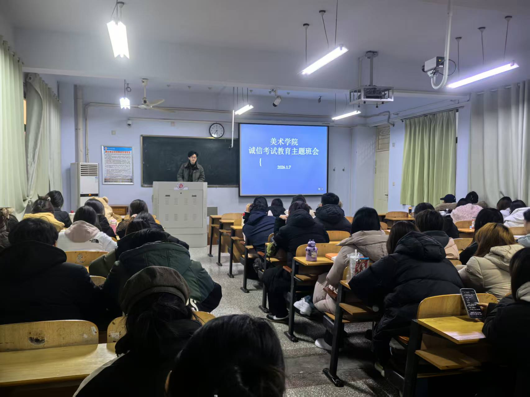 为进一步强化学风建设,增强学生诚信考试观念,营造公平、公正的考试氛围,1月6日至7日,美术学院各年级陆续组织开展期末考试诚信教育主题班会,全体学生参与。
