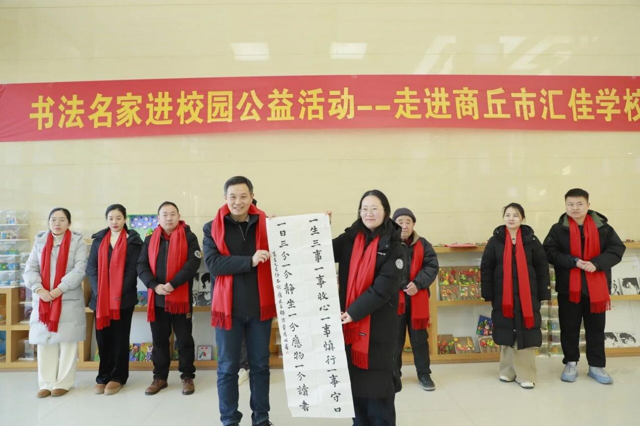 活动在汇佳学校敦品楼大厅拉开帷幕。汇佳学校刘春莉校长致欢迎辞,对我院组织此次活动表示衷心感谢。学生代表为到场的书法家佩戴红围巾,表达崇高敬意。李林在致辞中介绍了“蒲公英大讲堂•美育浸润行动”的宗旨与实施情况,强调了我院在推动专业成果服务社会美育、促进传统文化传承方面的责任与努力。仪式上,我院及到场书法家向汇佳学校赠送了多幅书法作品,传递美好祝愿。