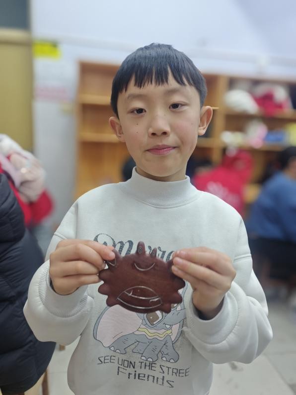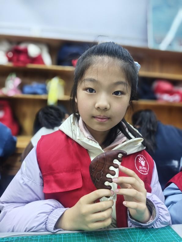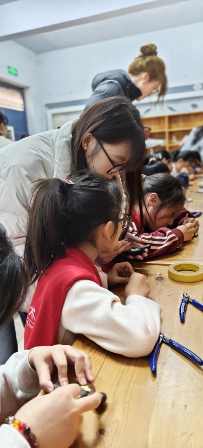 下午,孩子们走进木雕工作室,亲身体验非遗“木错银”技艺。该技艺于2021年被认定为商丘市非物质文化遗产保护项目,我院程坤、李建两位老师荣获“商丘市非物质文化遗产代表性传承人”称号。学院木雕教学以镶嵌技艺为核心,构建了涵盖设计、制作与服务的完整教学模式,有力推动了产学研的融合。学生通过参与文创赛事、展览、创意市集等活动,实现从专业学习到创业实践的转化,有效促进了木雕技艺在当代的传承与创新。