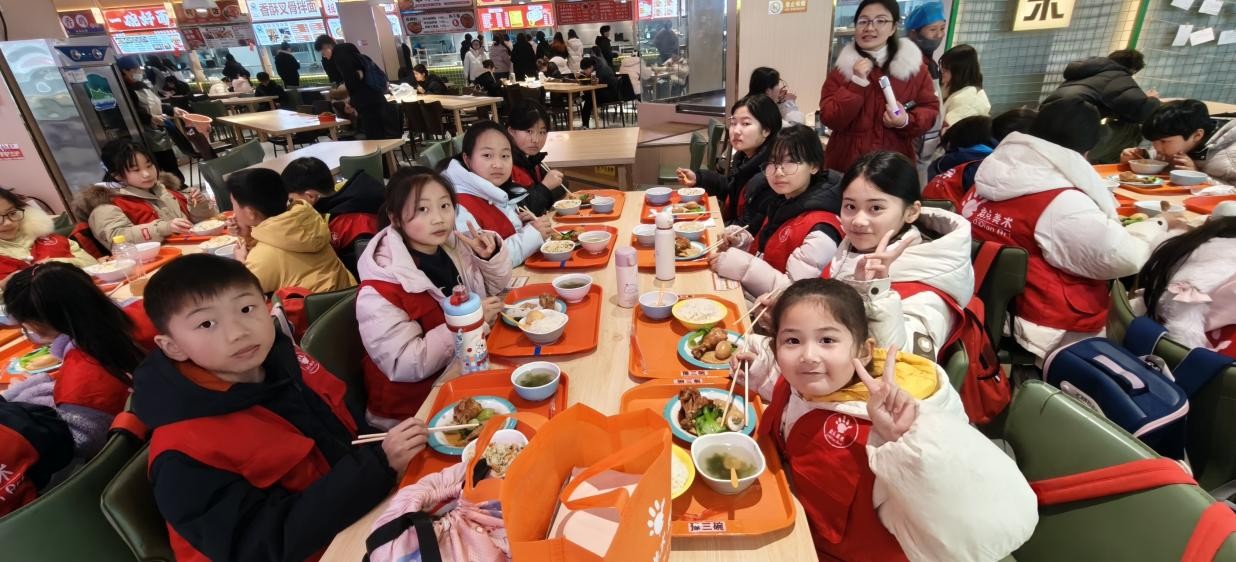 参观结束后,孩子们来到大学食堂,体验大学生日常饮食,也在心底埋下了一颗向往大学的种子。午餐干净卫生、荤素搭配,孩子们积极践行“光盘行动”,展现了良好的文明素养。