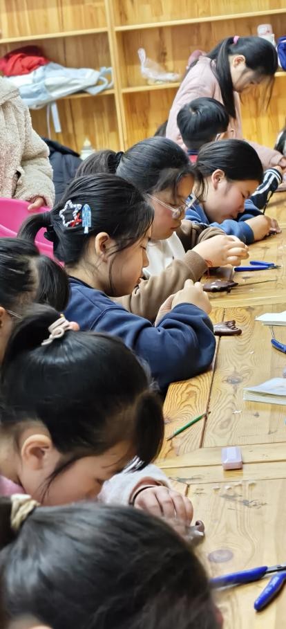 在天然红木与温润银丝的邂逅中,孩子们在老师指导下尝试镶嵌、敲打、抛光等工序。每一步都考验专注与耐心,他们以原木与银丝为原材料,慢慢雕琢成一件件充满温度的木错银动物镜或木梳。