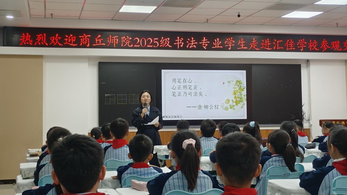 上午,师生前往汇佳学校,在副校长杨艳与书法教师吕伟陪同下,参观校园文化阵地、敦品楼展厅及专用书法教室,直观感受校园书法教育成果。欢迎仪式上,杨艳副校长介绍学校书法课程特色与育人成效,表达深化校院合作的意愿;杨烨副院长对学校美育工作表示高度认可,勉励同学们以此次见习为契机,完成从 “学书法” 到 “教书法” 的转变,潜心积累教学经验。随后,大家观摩安依娜老师二年级书法公开课,感受趣味化、新课标导向的小学书法课堂教学。