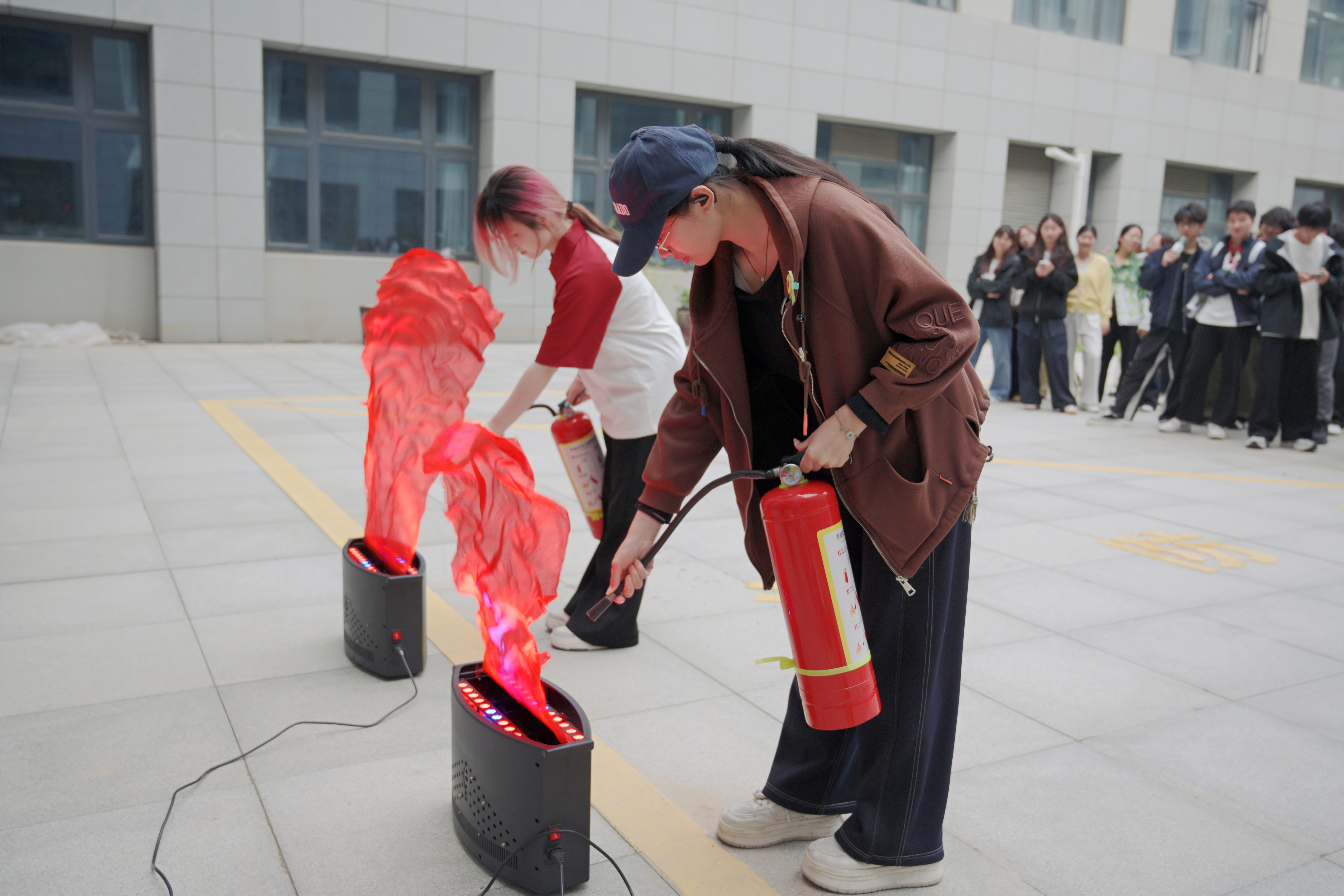 讲解演示结束后,参训学生分批依次进行了灭火器实操演练。面对模拟火源,大家按照规范步骤,冷静操作,成功扑灭火点。