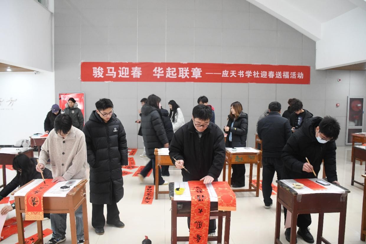 为弘扬中华优秀传统文化,12月26日下午,美术学院应天书学社在艺术中心一楼大厅举办“骏马迎春,华起联章”迎春送福活动。二十余位师生齐聚一堂,以笔墨传递温暖祝福,共同迎接新春佳节。
